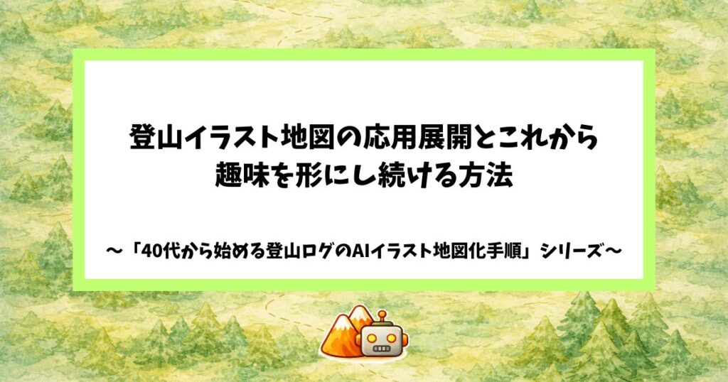 ここまで、登山ログを水彩画風のイラスト地図に整える手順を順番に解説してきました。 最終回では、この手法をどのように応用できるのか、そしてこのシリーズの先にある可能性について整理します。 無理に広げる必要はありません。小さく積み上げる延長の... 生成AI活用法
