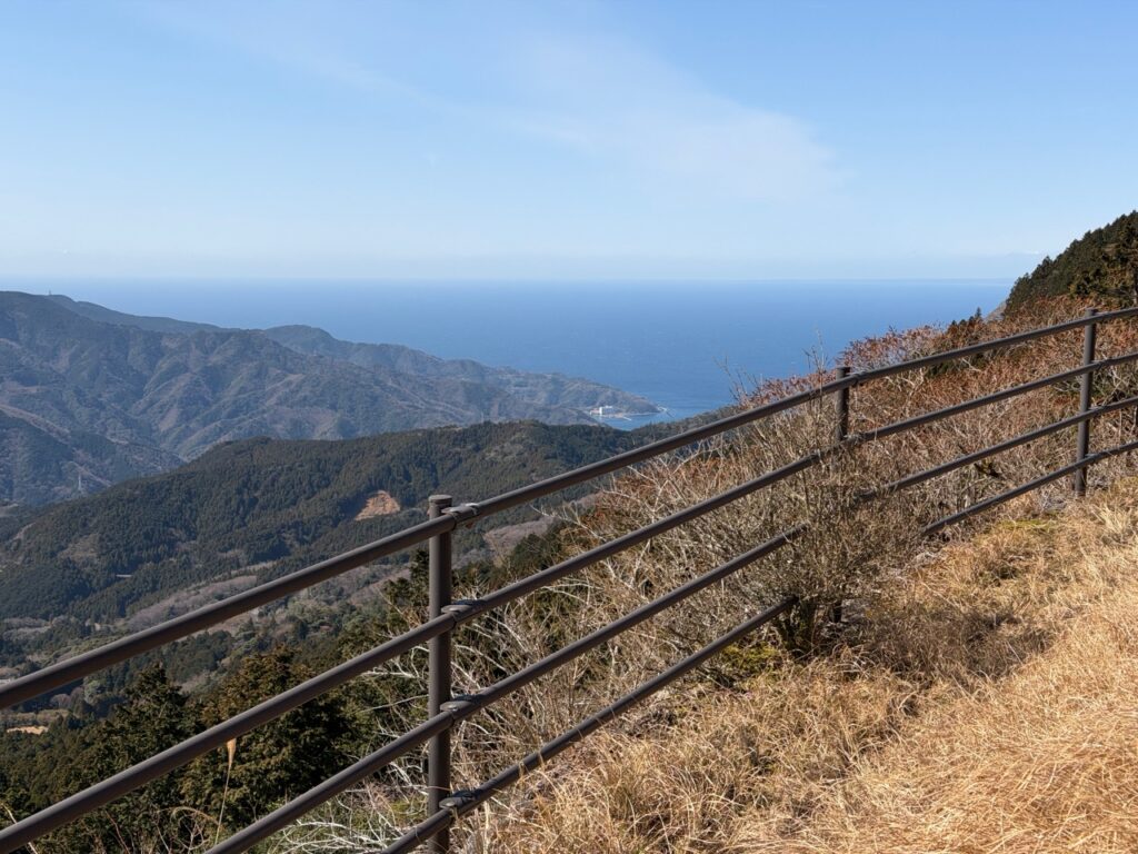 途中のある土肥駐車場で、土肥港と対面にある清水港を行き来する船舶を眺めたら、山道と車道を行き来しながらの稜線歩きがスタートです。時折見える深いブルーが印象的な駿河湾への眺めを楽しみながら1時間ほど進むと「古稀山」という小山に到着です。