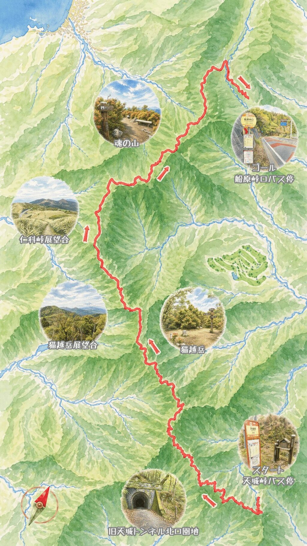 - ルート(帰り):仁科峠展望台 → 風早峠 → 宇久須峠 → 魂の山 → 土肥峠 → 棚場山 → 船原峠 → 船原峠口バス停