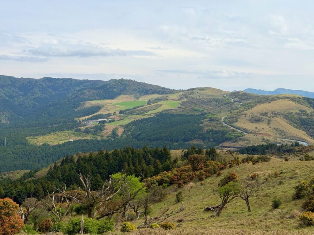 「仁科峠展望台」からなだらかな1笹原の斜面を駆け降りて、西伊豆スカイラインを横断。開放的な稜線を歩いていきます。