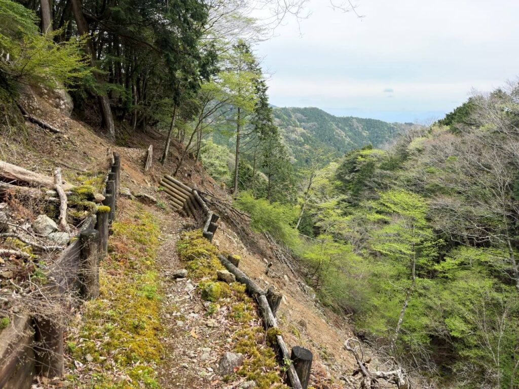 小ピークを登り、それと同じくらい下ったところで、本格的な登りが始まります。急斜面につけられた、段差の大きい木の階段を一歩一歩登っていきます。背の高い木々も増えてきて、登ることに集中できる区間でもあります。