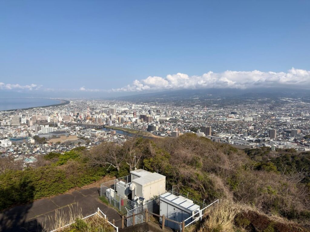10分ほど坂道を登ると「香陵台」に到着です。この公園にはベンチが豊富にあるので、身支度を整える場所として使いやすいです。沼津港や五重塔を眺めつつ、準備をしたら、公衆トイレに立ち寄った後、まずは、「香貫山山頂」へと登っていきます。
