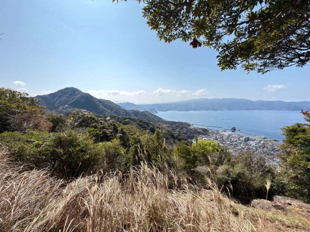 樹林帯の中、30分ほど小刻みなアップダウンを繰り返すと、パッと視界が広がり「千金岩」に到着です。眼下に静浦漁港、駿河湾を挟んで対岸の伊豆半島、そしてこれから登る沼津アルプス最高峰の鷲頭山への展望が楽しめます。