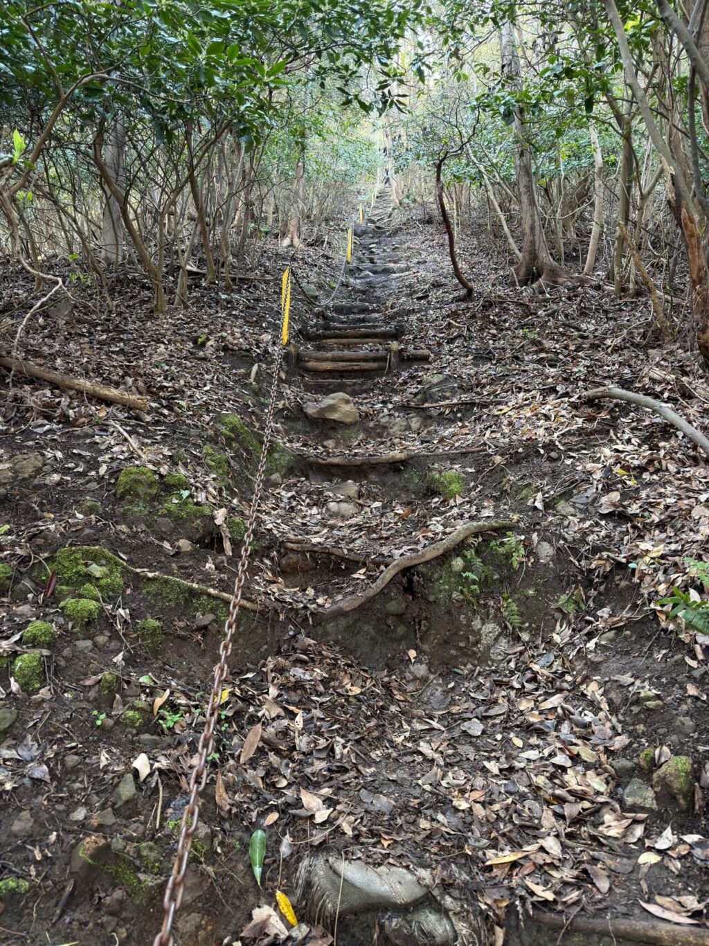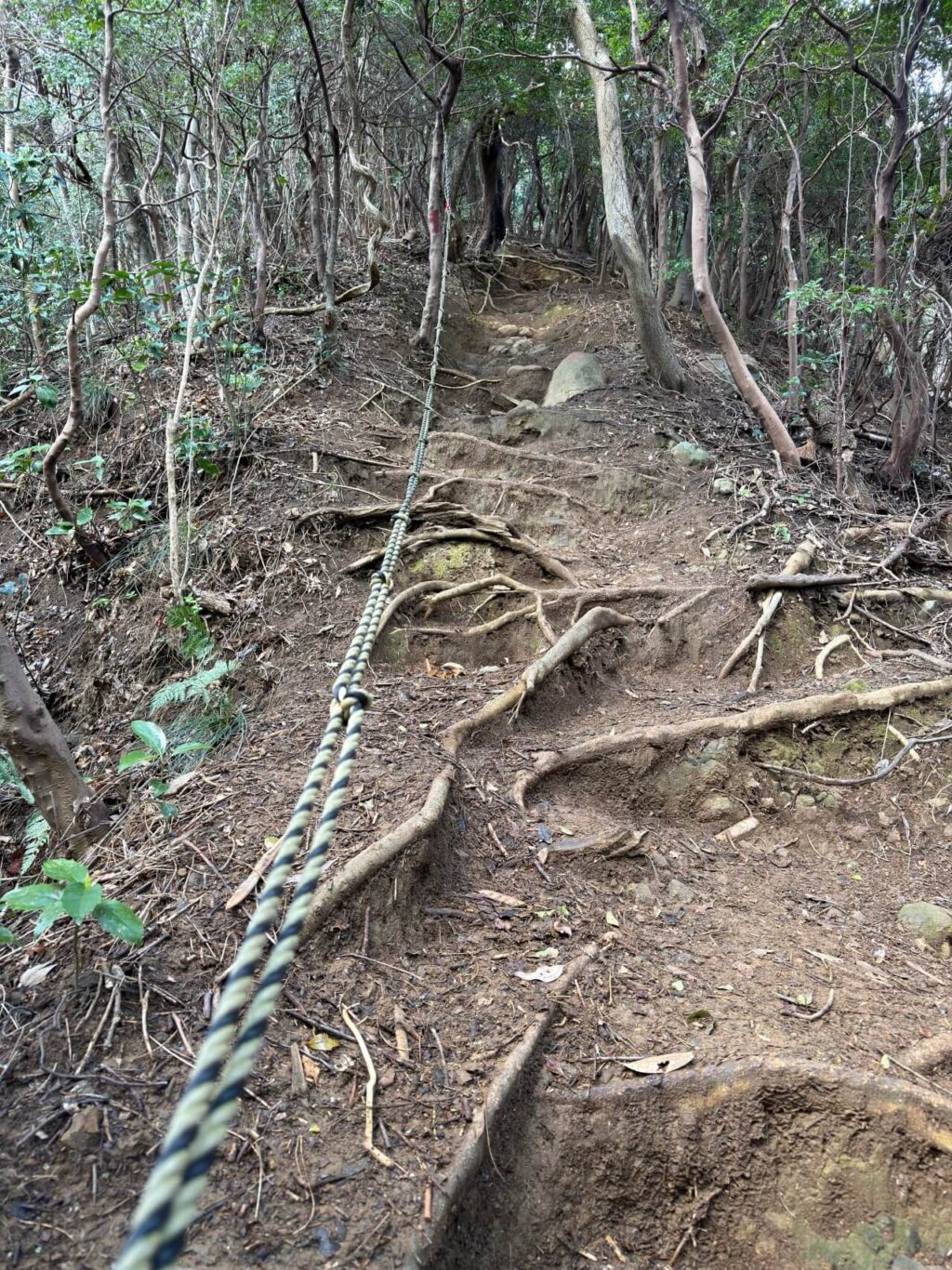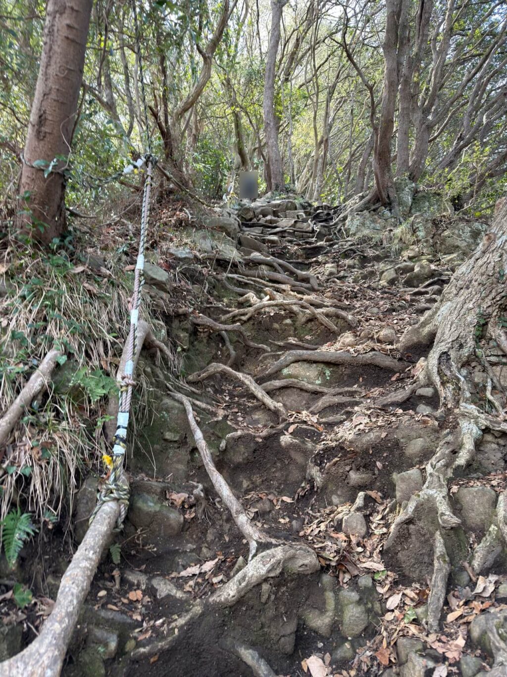 「志下峠」まで一旦降り、「中将宮」まで登ると、そこからは、沼津アルプスでも特に急な登りが続く区間に入ります。場所によっては、岩や木々を掴んで攀じ登る必要が出てきますので、張ってあるロープを使って、慎重に登ります。